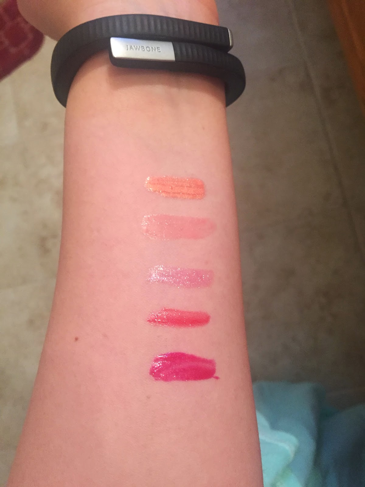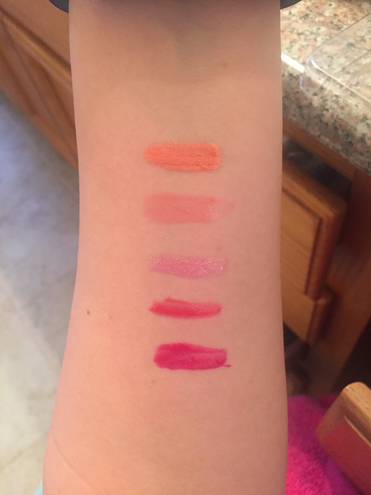 This Hypershine set is a set of 5 different lip glosses, ranging from a peachy color to a dark pinker color. Is pinker a word? I think I meant more pink. But here goes nothing.