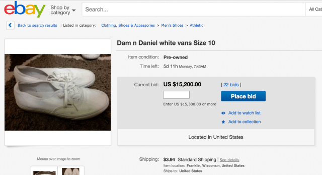 Not only has this saying of “Dam Daniel…back at it again with the white vans” gone viral but the sales of white vans have gone up tremendously. Check out the insane price on these “Dam Daniel white vans” going for $15,200 on Ebay. If you don’t have $15,200 for those shoes you can always purchase the original new white vans for only $45 via Vans Store if you are interested in purchasing them.